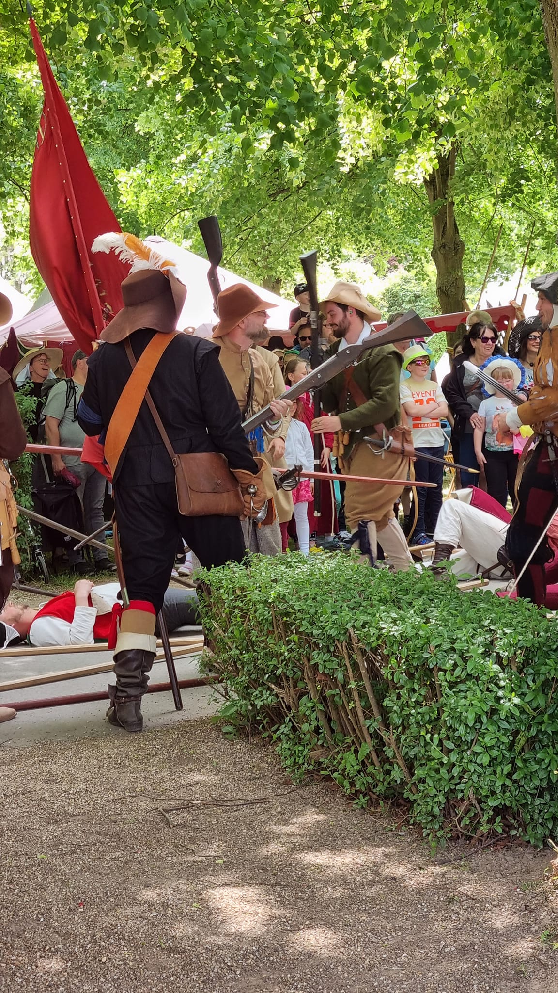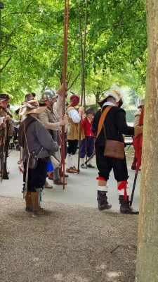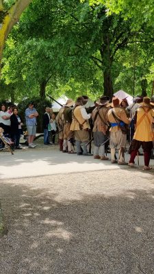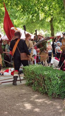 Am Pfingstsonntag und Pfingstmontag war der Markt offiziell für Pubplikum zugänglich. Es gab diverse Vorführungen der Landsknechte auf der Straße hinter unserem Lager. An beiden Tagen stellte Herr Rheinhold seine Ausrüstung zur Schau und beantwortete die Fragen neugieriger Besucher. Es war sehr warm und sonnig; es fiel dabei auf, dass wir die Strohhüte zu Hause vergessen hatten und so hatte der Herr Rheinhold schnell einen Sonnenbrand im Nacken. Anna hat es in diesem Jahr mit ihrem Stand in einen lokalen Presseartikel geschafft: Foto